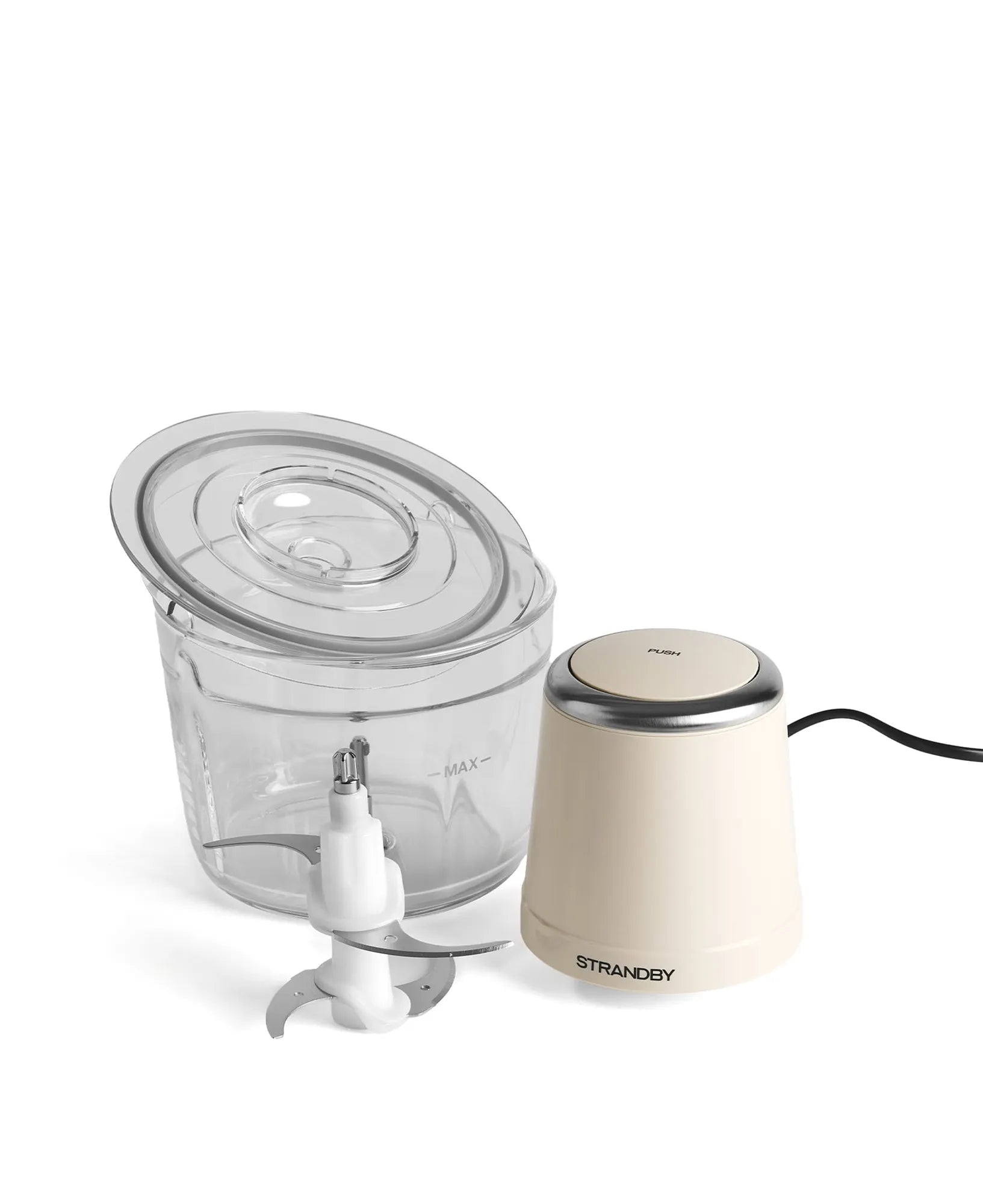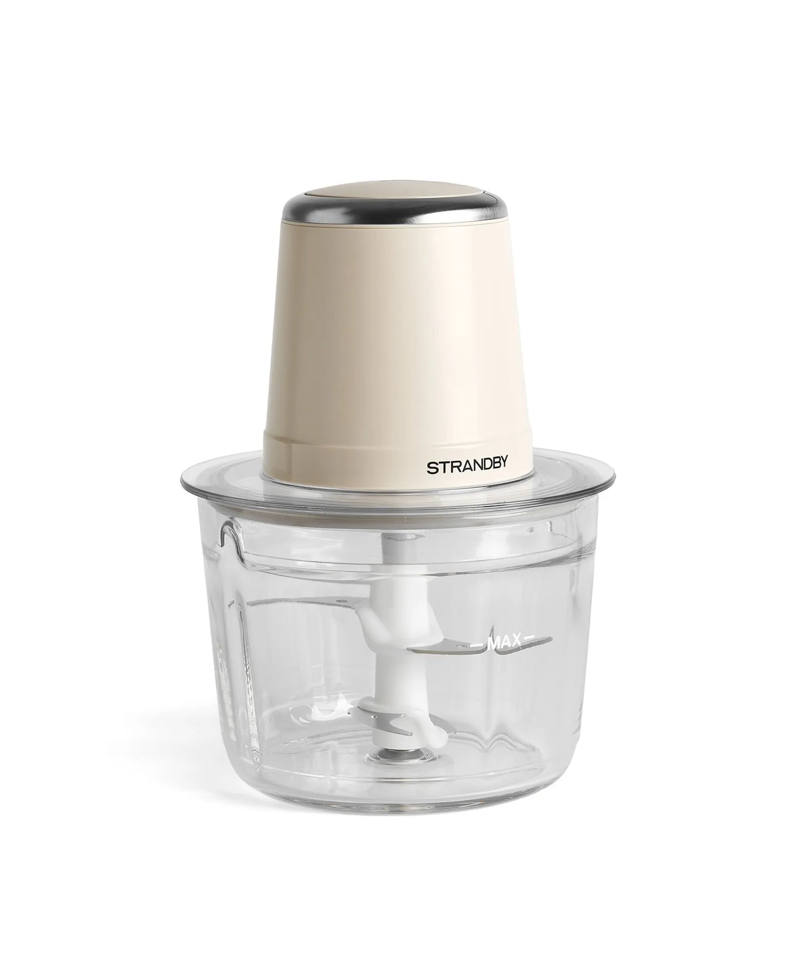 Den stilrena designen förstärks av en elegant ring i rostfritt stål på ovansidan, medan det transparenta locket ger full kontroll över hackningsprocessen. En silikonbas under skålen säkerställer att apparaten står stadigt på köksbänken under användning.