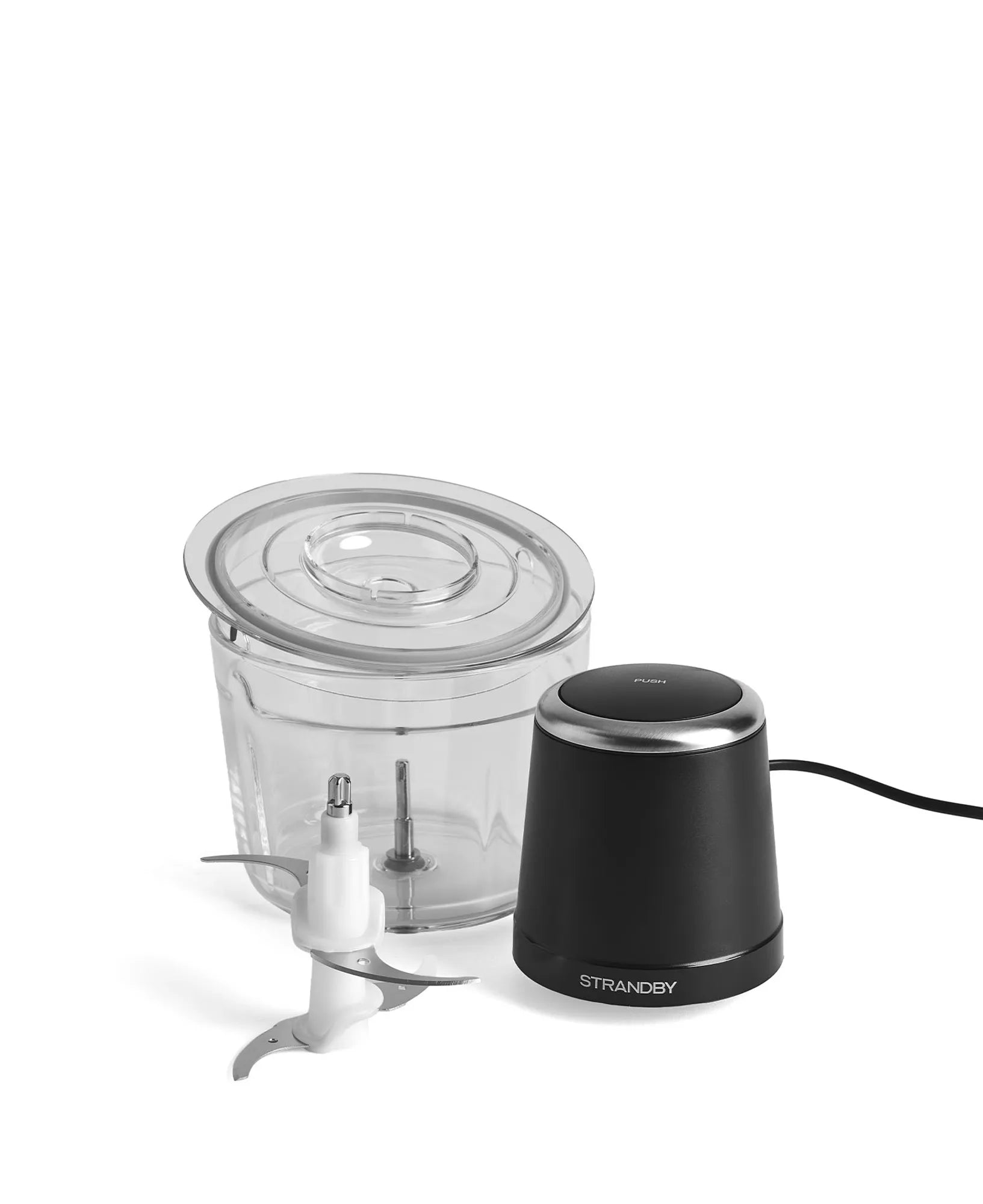 Den stilrena designen förstärks av en elegant ring i rostfritt stål på ovansidan, medan det transparenta locket ger full kontroll över hackningsprocessen. En silikonbas under skålen säkerställer att apparaten står stadigt på köksbänken under användning.