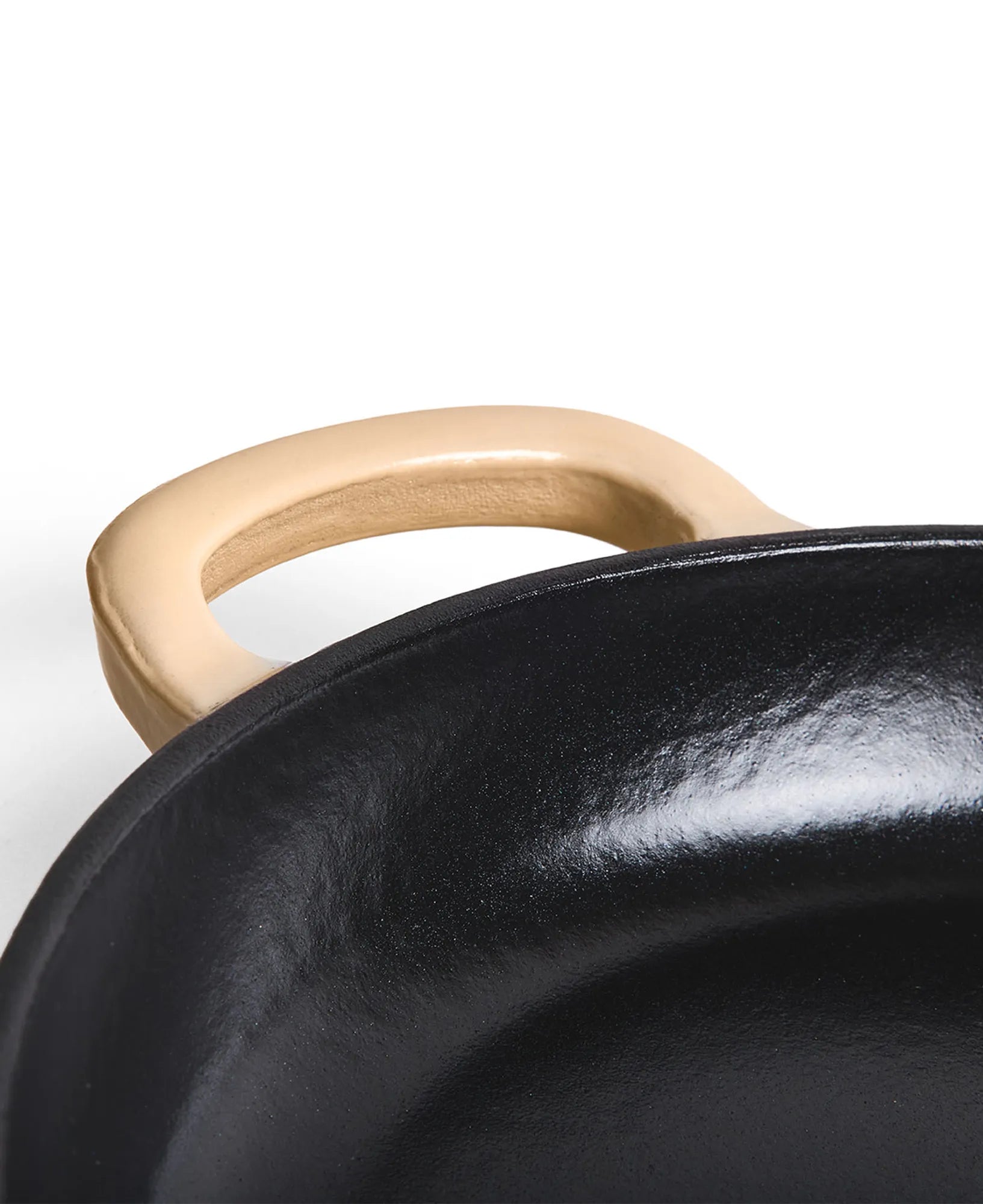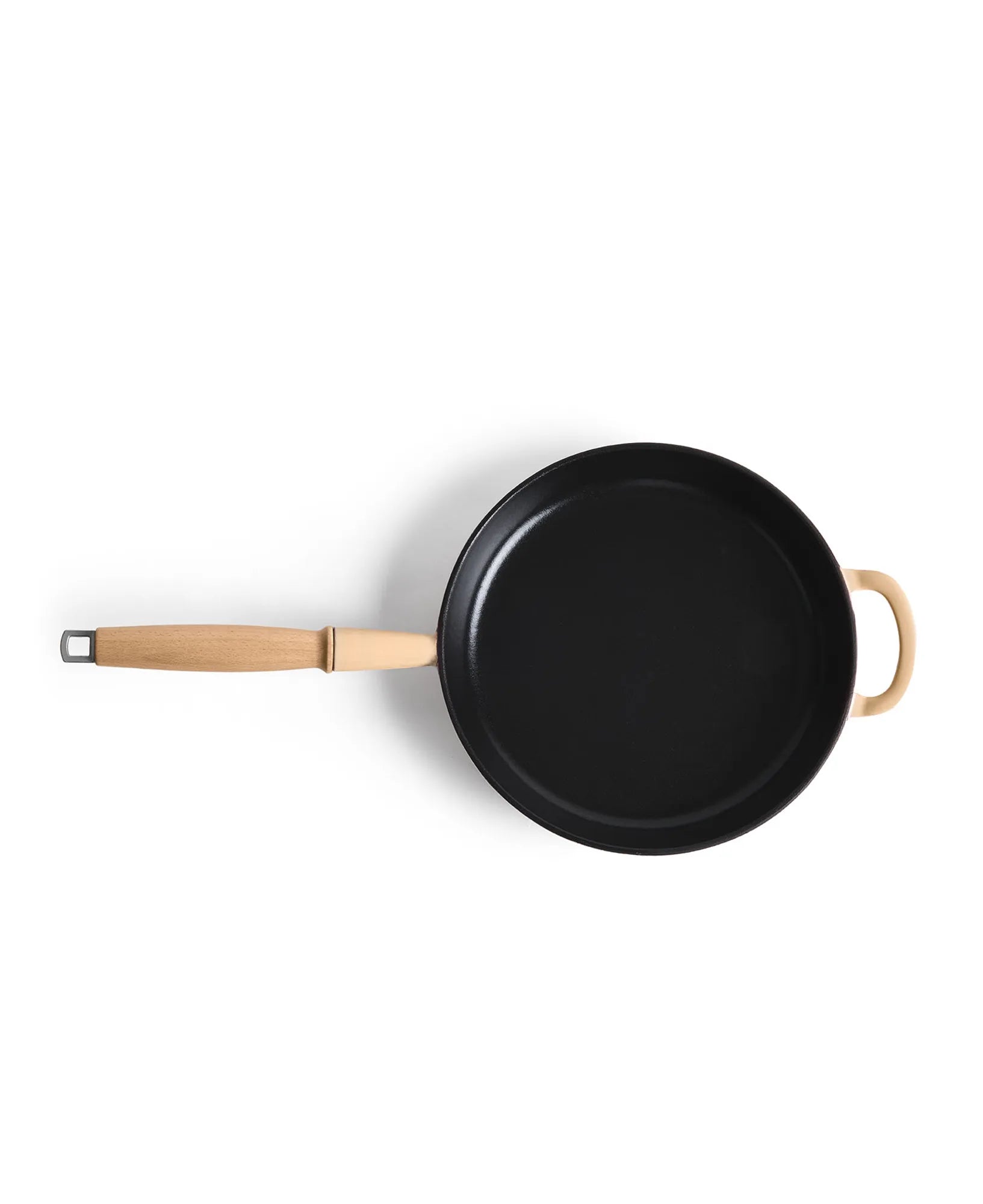 Pannan har en emaljerad utsida som skyddar mot slitage och ger ett stilrent uttryck, medan insidan är försedd med emalj och non-stick-beläggning för enkel matlagning och smidig rengöring. Det ergonomiska trähandtaget ligger bekvämt i handen och ger ett säkert grepp, samtidigt som det håller sig svalare under användning.