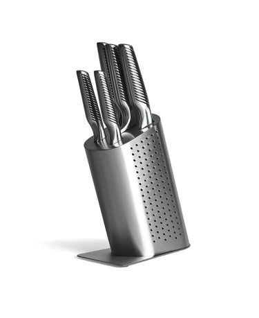 Alla knivar är utrustade med blad i rostfritt stål som ger en perfekt balans mellan skärpa och slitstyrka. De rostfria handtagen bidrar till en elegant design och ett behagligt grepp.