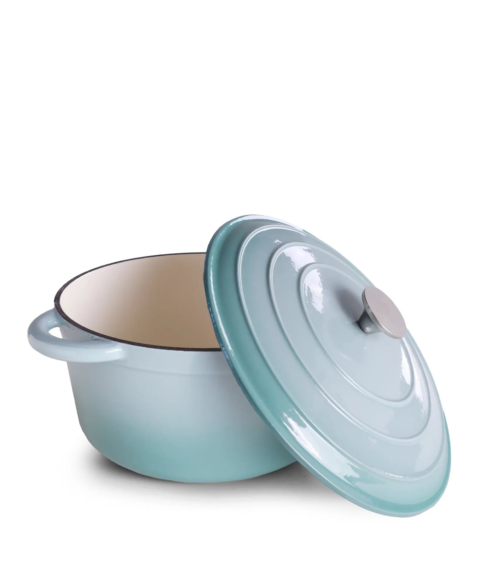 Grytans kärna är tillverkad av massivt gjutjärn, vilket ger en exceptionell värmelagring för jämn och långsam tillagning. Ytan är belagd med en miljövänlig emalj, noggrant utvald från Turkiet, som inte bara gör grytan enkel att rengöra utan också skyddar den mot fläckar och lukt. Emaljbeläggningen är fri från skadliga kemikalier, vilket gör den säker både för dig och miljön. Locket är försett med en elegant rostfri knopp, som tål höga temperaturer och ger en stilren touch till grytans robusta design.