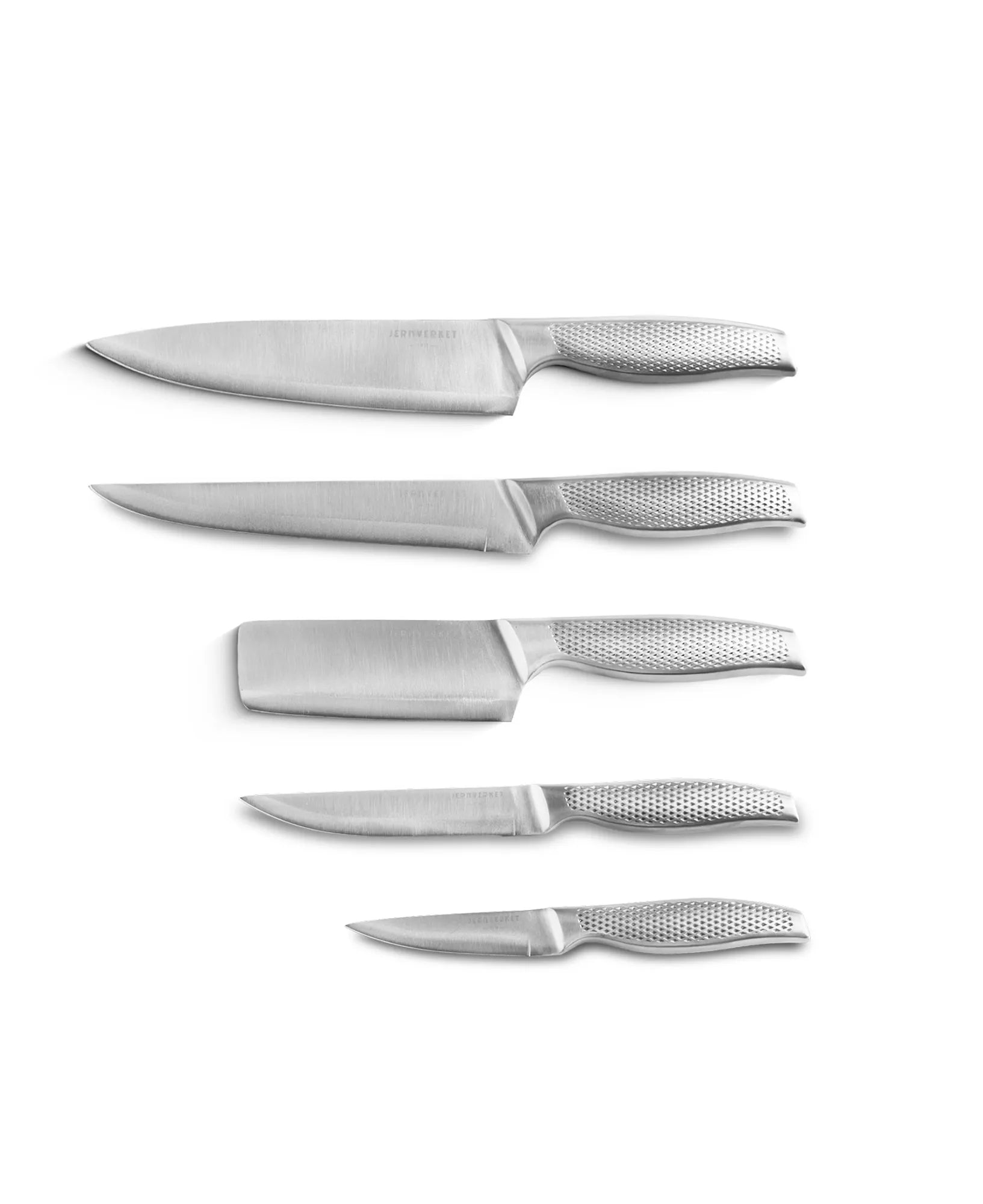 Alla knivar har blad av rostfritt stål , känt för sin balans mellan skärpa och slitstyrka. Även handtagen är tillverkade av rostfritt stål , vilket ger en stilren design och god ergonomi.