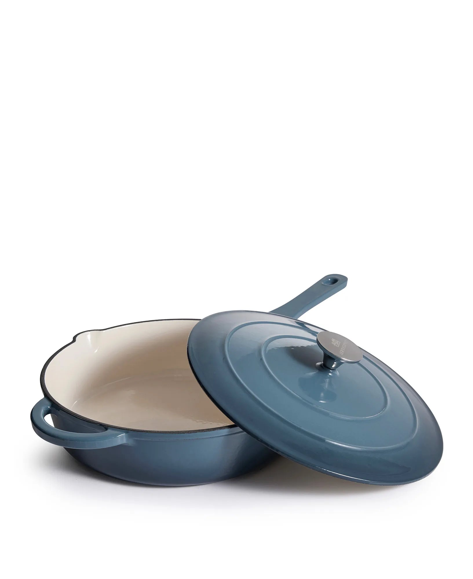 Pannan är tillverkad av högkvalitativt gjutjärn och täckt med en miljövänlig emalj, som inte bara skyddar pannan utan också är skonsam mot både dig och miljön. Emaljens hållbarhet säkerställer att din traktörpanna kommer att hålla i många år, samtidigt som den är enkel att rengöra och resistent mot fläckar och lukt. Insidan är belagd med en klassisk vit emalj, som ger en ren och tidlös look samt en lättskött yta att laga mat på. Locket är försett med en rostfri knopp som tål höga temperaturer och fulländar den eleganta designen.