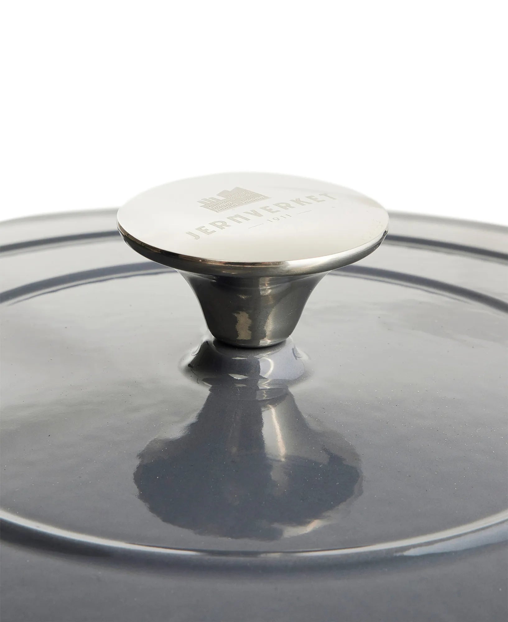 Pannan är tillverkad av högkvalitativt gjutjärn och täckt med en miljövänlig emalj, som inte bara skyddar pannan utan också är skonsam mot både dig och miljön. Emaljens hållbarhet säkerställer att din traktörpanna kommer att hålla i många år, samtidigt som den är enkel att rengöra och resistent mot fläckar och lukt. Insidan är belagd med en klassisk vit emalj, som ger en ren och tidlös look samt en lättskött yta att laga mat på. Locket är försett med en rostfri knopp som tål höga temperaturer och fulländar den eleganta designen.