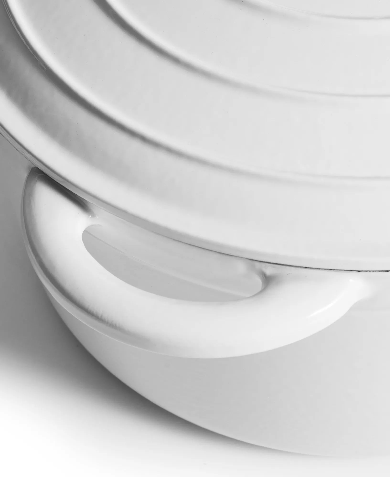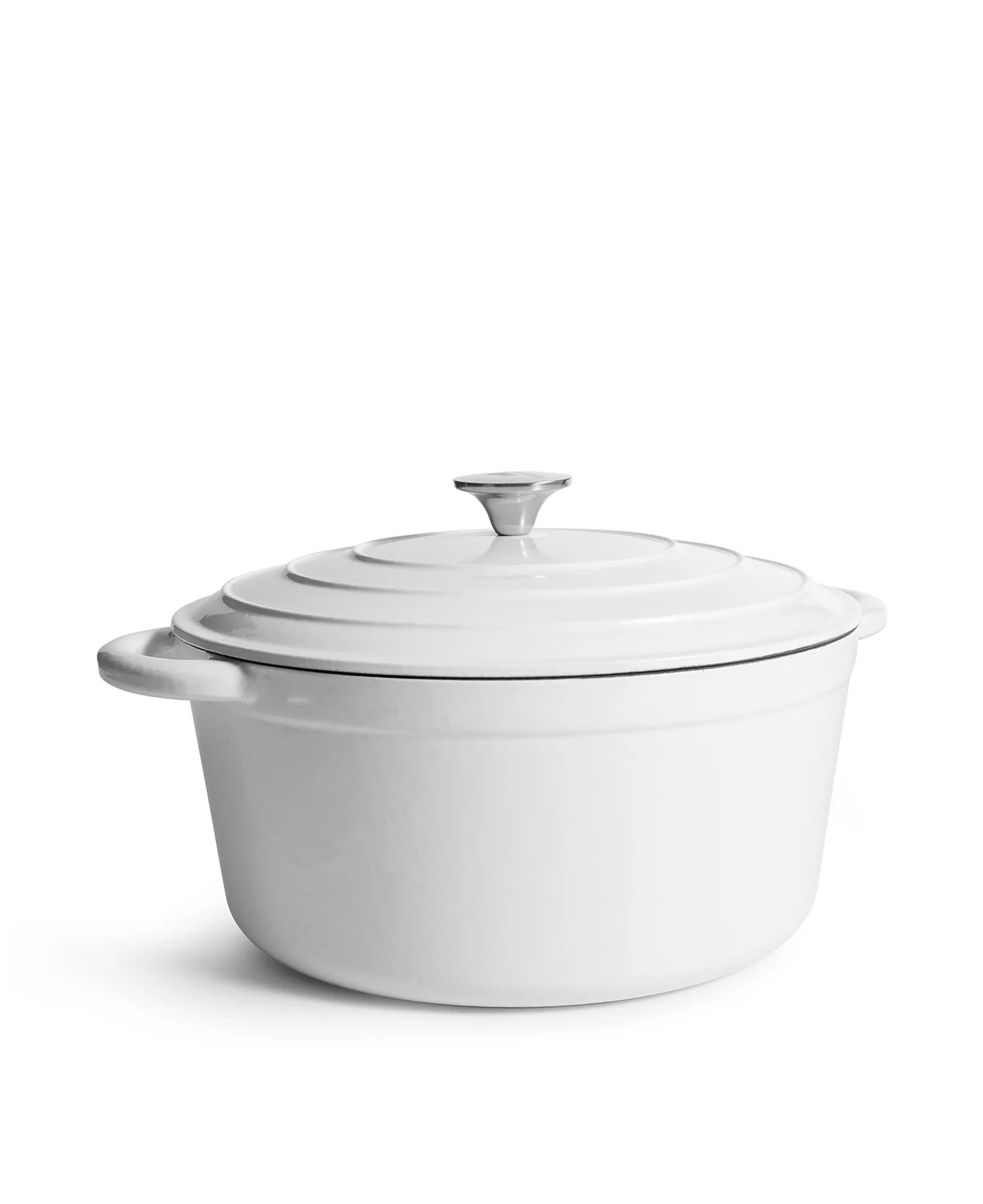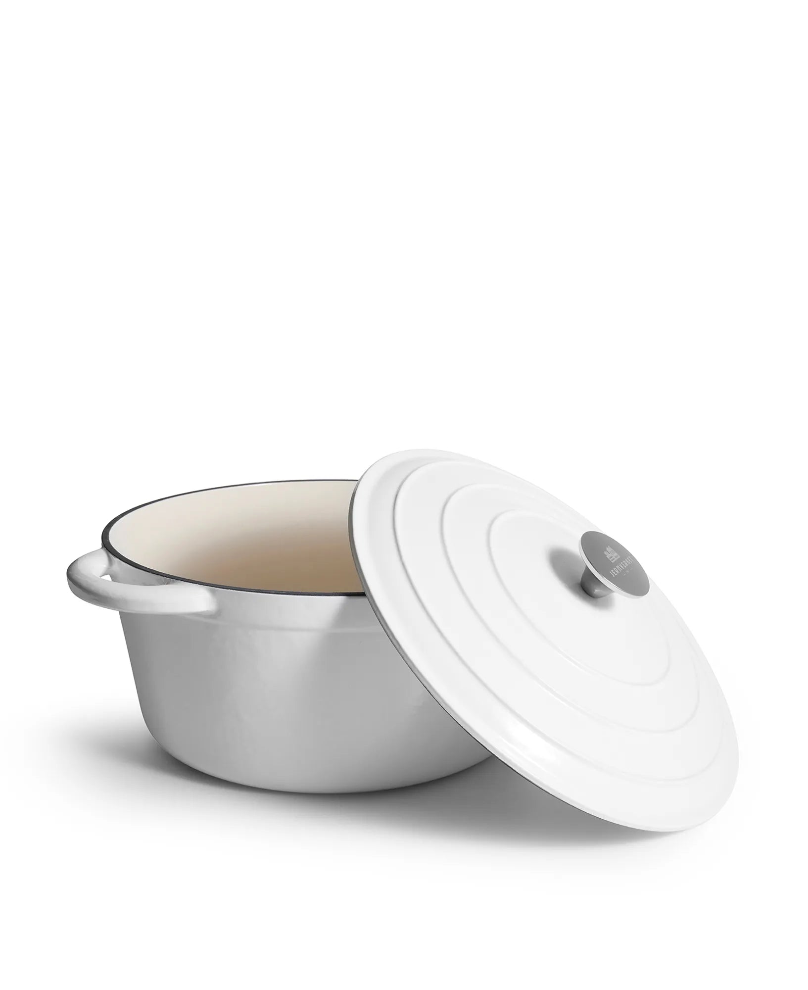 Grytans kärna är tillverkad av massivt gjutjärn, vilket ger en exceptionell värmelagring för jämn och långsam tillagning. Ytan är belagd med en miljövänlig emalj, noggrant utvald från Turkiet, som inte bara gör grytan enkel att rengöra utan också skyddar den mot fläckar och lukt. Emaljbeläggningen är fri från skadliga kemikalier, vilket gör den säker både för dig och miljön. Locket är försett med en elegant rostfri knopp, som tål höga temperaturer och ger en stilren touch till grytans robusta design.