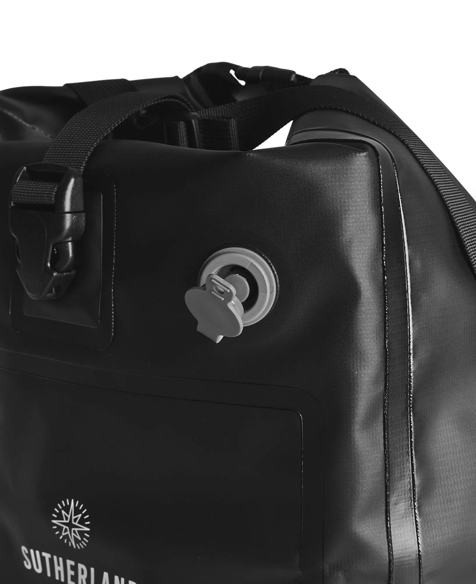 En praktisk frontspänne/buckle gör det möjligt att säkra ryggsäckens övre del extra stabilt, vilket ökar stabiliteten under rörelse och tuffare aktiviteter. På övre högra sidan finns dessutom en luftventil (air tap) som gör det möjligt att blåsa in luft i väskan, öka lufttrycket och därigenom förbättra den vattentäta prestandan ytterligare.
