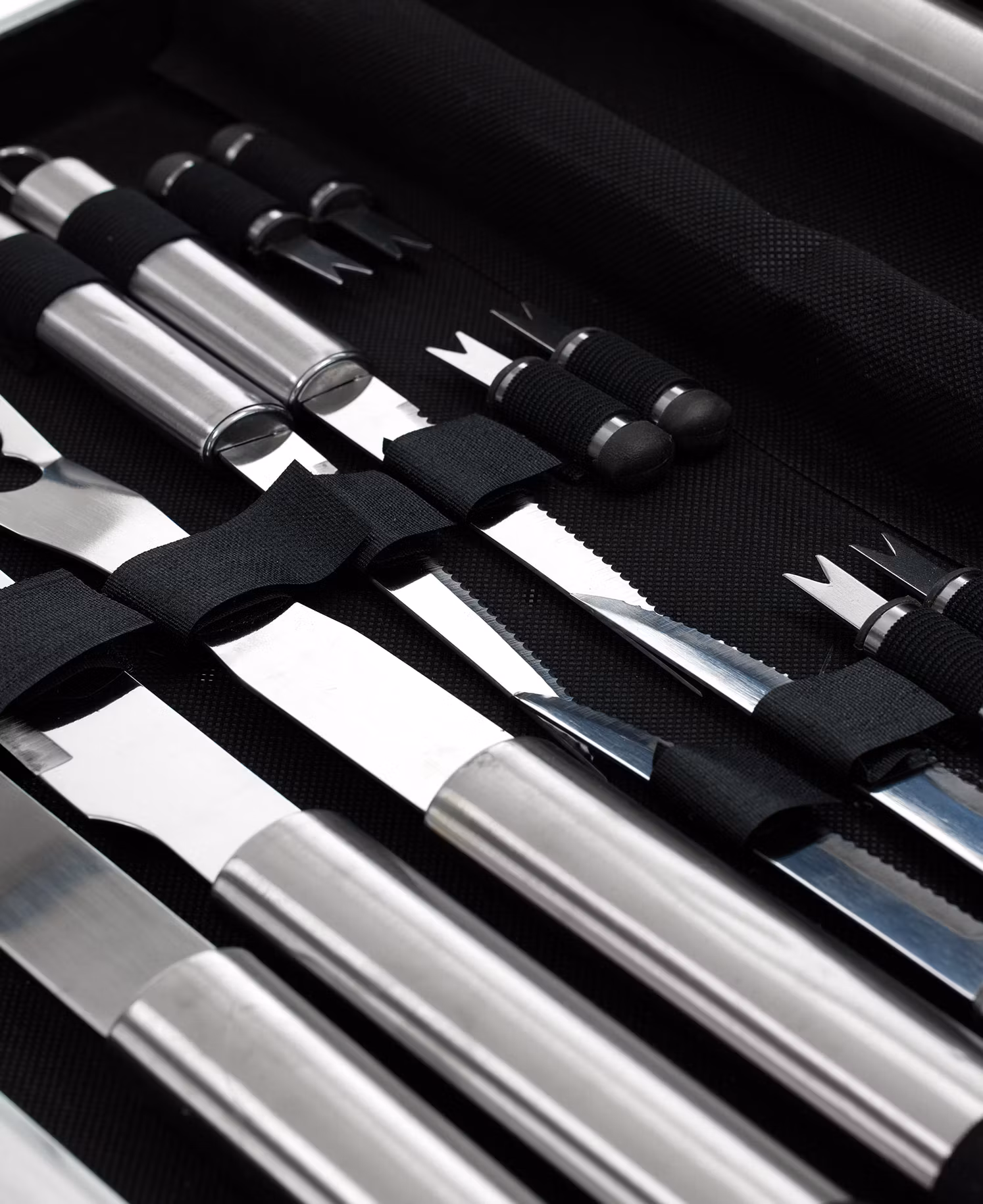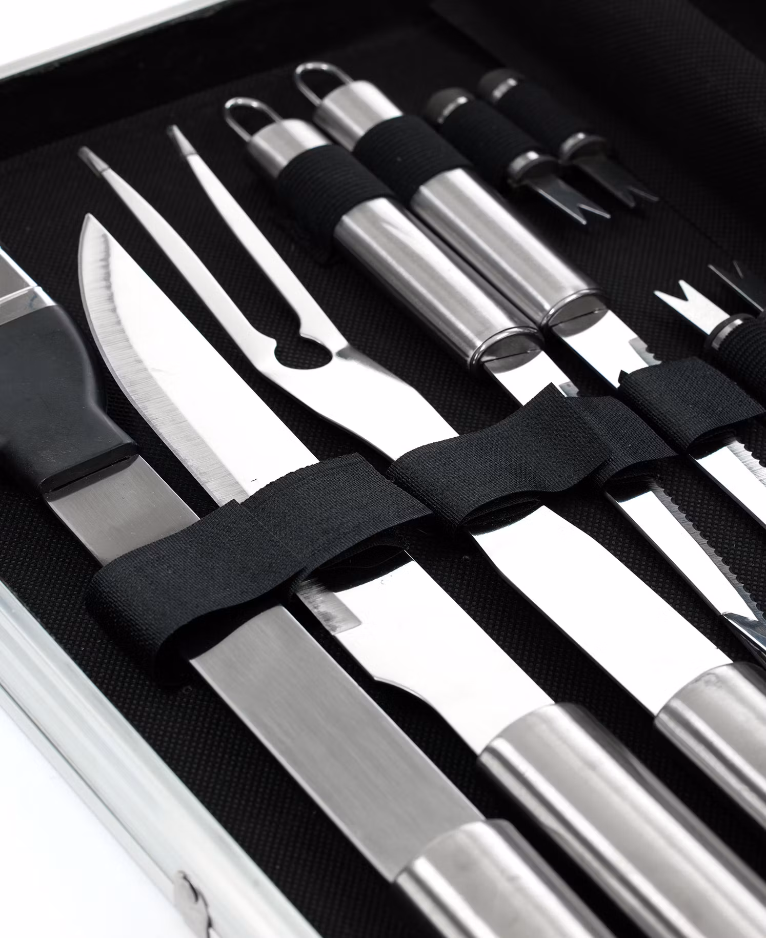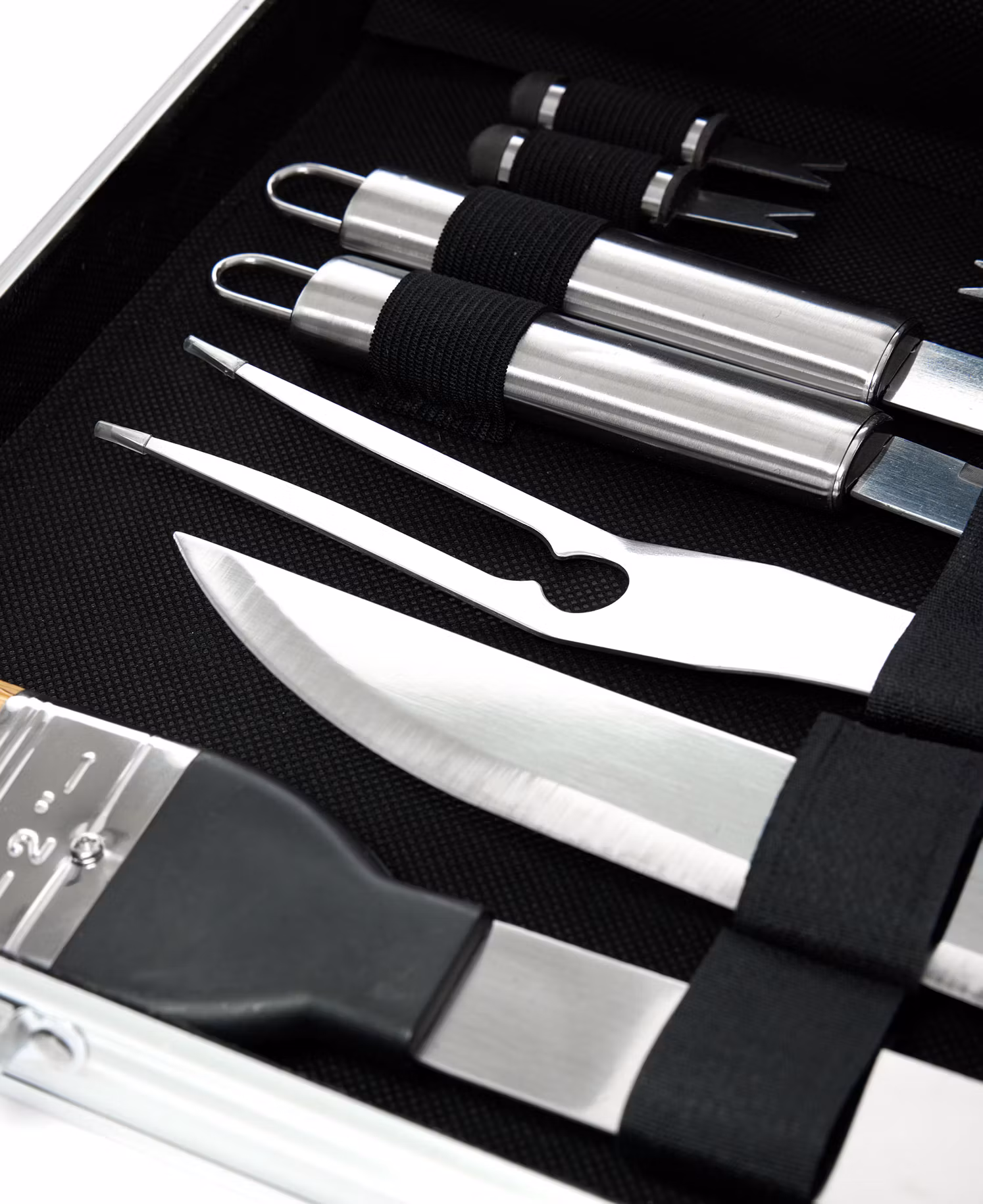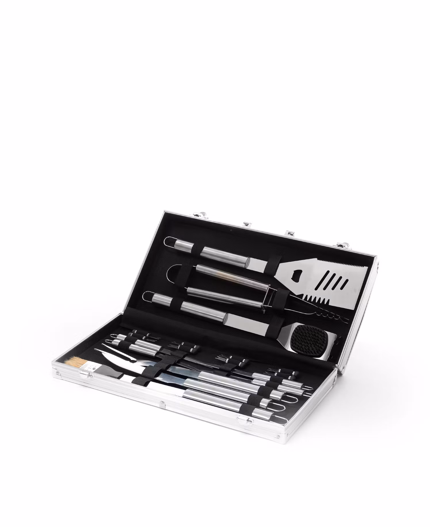 Agera grillmästare med vårt exklusiva 18-delars grillset, komplett med en aluminiumväska för att göra varje grillning till en stilig prestation! Varje verktyg i detta kit är noga utformat för att lyfta din grillupplevelse till nya höjder. I detta förstklassiga set finns: 1 spatel, 1 tång, 1 rengöringsborste, 1 pensel för glasyr, 1 kniv, 1 gaffel, 4 biffknivar och 8 majshållare – allt perfekt organiserat i en aluminiumväska. Denna väska är inte bara ett praktiskt förvaringsalternativ, den är också en elegant följeslagare för dina kulinariska äventyr.
