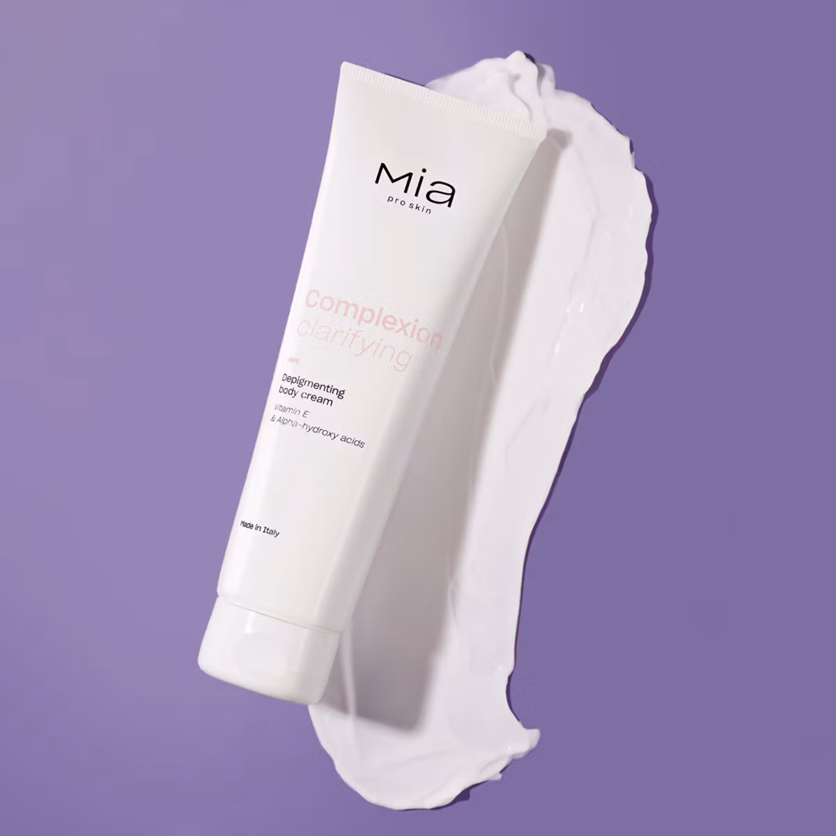 Depigmenterande Body Cream specifik för blekning av pigmentförändringar, minska och eliminera hud fläckar på armar, ben, rygg, axlar och rygg. Complexion Clarifying innehåller specifika alfahydroxisyror för behandling av hud missfärgningar som melasma, kloasma, sol och ålders fläckar. Tack vare vitaminerna C, E och mandel syra, utför den försiktigt en lättande verkan på de behandlade områdena och främjar återuppbyggnaden av skadade vävnader. Lämplig för alla hud typer, det rekommenderas att applicera krämen cykliskt på de drabbade områdena för att förlänga dess effekter med tiden.